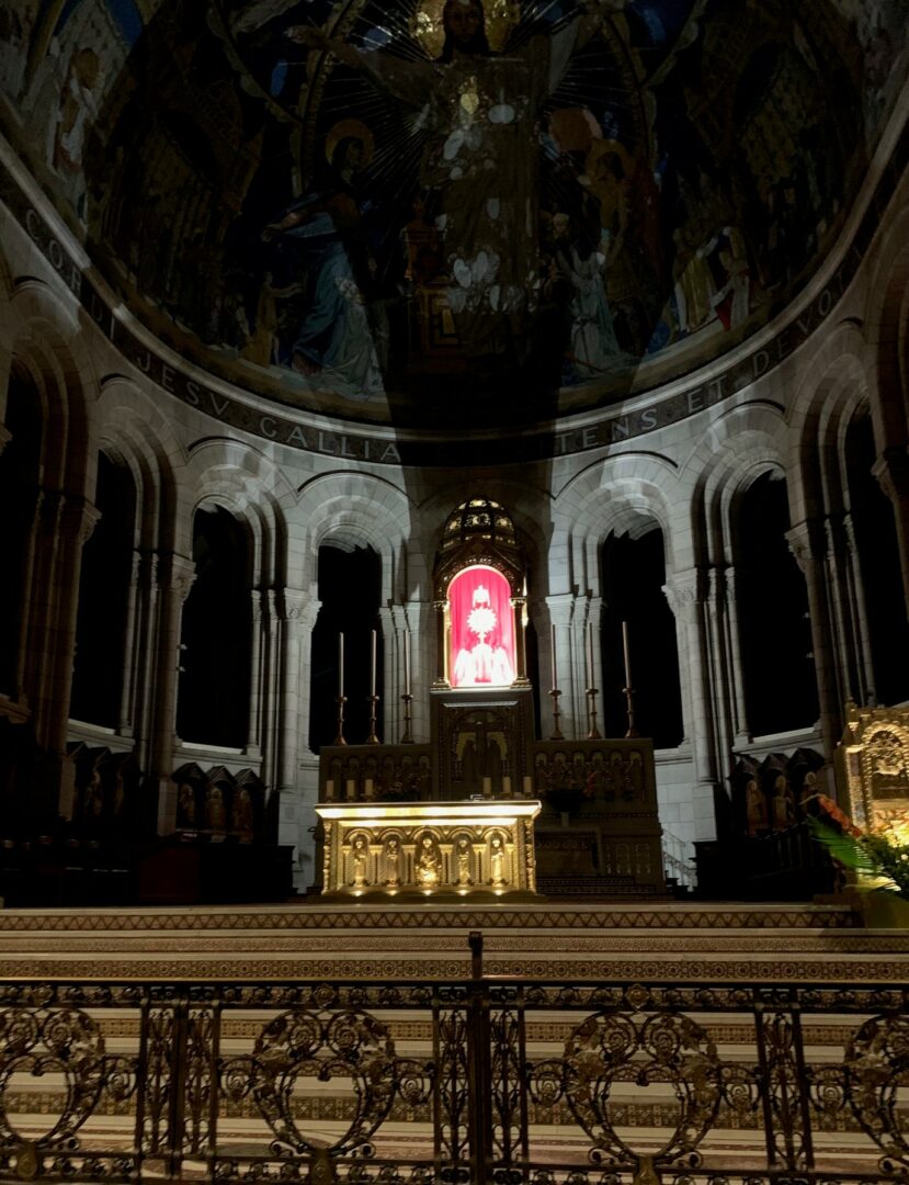 En fin d’après-midi nous avons rejoint le Sanctuaire du Sacré-Cœur de Montmartre, tenu par les Bénédictines qui nous accueillies pour vivre l’expérience de l’Adoration du Saint-Sacrement au cœur de la nuit pour ceux qui le désiraient. L’adoration du Saint-Sacrement n’a jamais cessé depuis le 1er août 1885 : « A Dieu rien n’est impossible ! ». Ce cœur à cœur dans le silence des ténèbres de la nuit est un moment suspendu, intime, profond, en vérité qui nous conduit invariable vers la Lumière de son Amour inconditionnel.