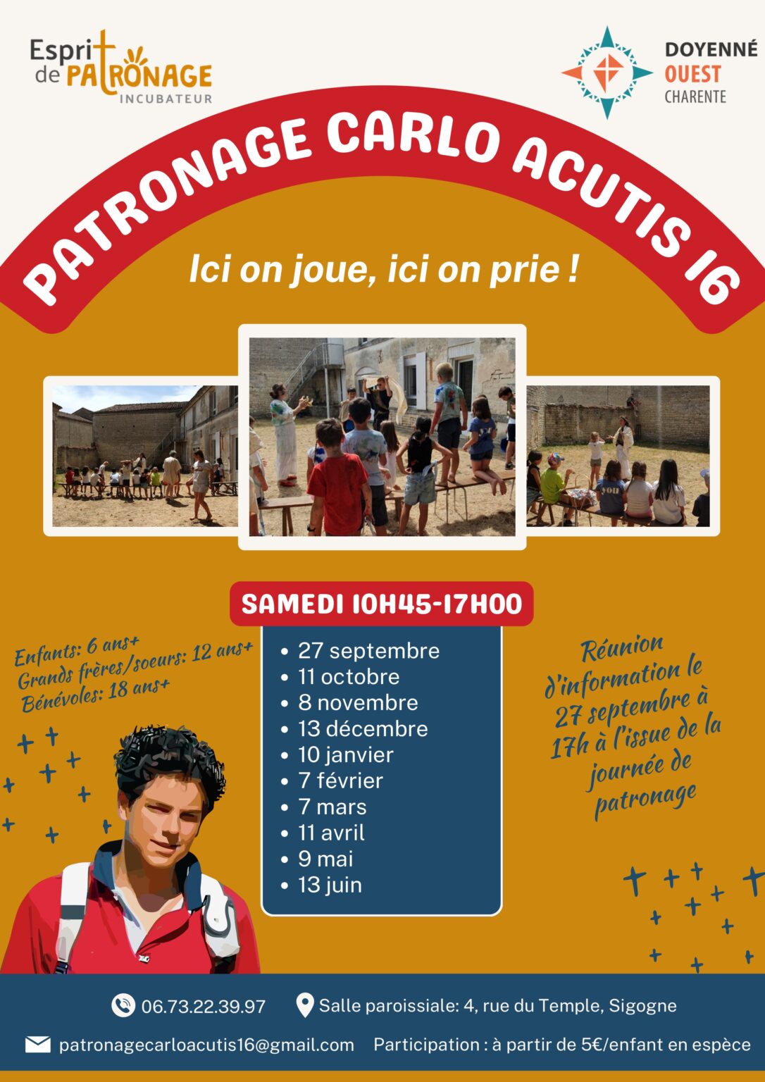 Un nouveau patronage dans le doyenné Ouest | Après une année d’expérimentation menée par Laëtitia et Dauphine (Mission Isidore) dans les paroisses de Châteauneuf-Segonzac et du pays de Jarnac, un patronage voit officiellement le jour : Carlo Acutis 16. Sous la responsabilité du Père Jean-François Mondy et de l’incubateur Esprit de Patronage, il accueillera les jeunes de 6 à 17 ans à la salle paroissiale de Sigogne à partir du 27 septembre 2025, puis chaque 2ᵉ samedi du mois (10h45-17h). Au programme : jeux, activités manuelles, prière, chant, préparation du repas, découverte du service de la messe et approfondissement de la foi. Une messe sera célébrée tous les deux mois à l’église de Sigogne. ➡️ Réunion de présentation le 27 septembre, après la première journée. Infos & inscriptions : patronagecarloacutis16@gmail.com – Marie-Anne de La Ruffie 06 73 22 39 97 (participation à partir de 5 €). |  | |