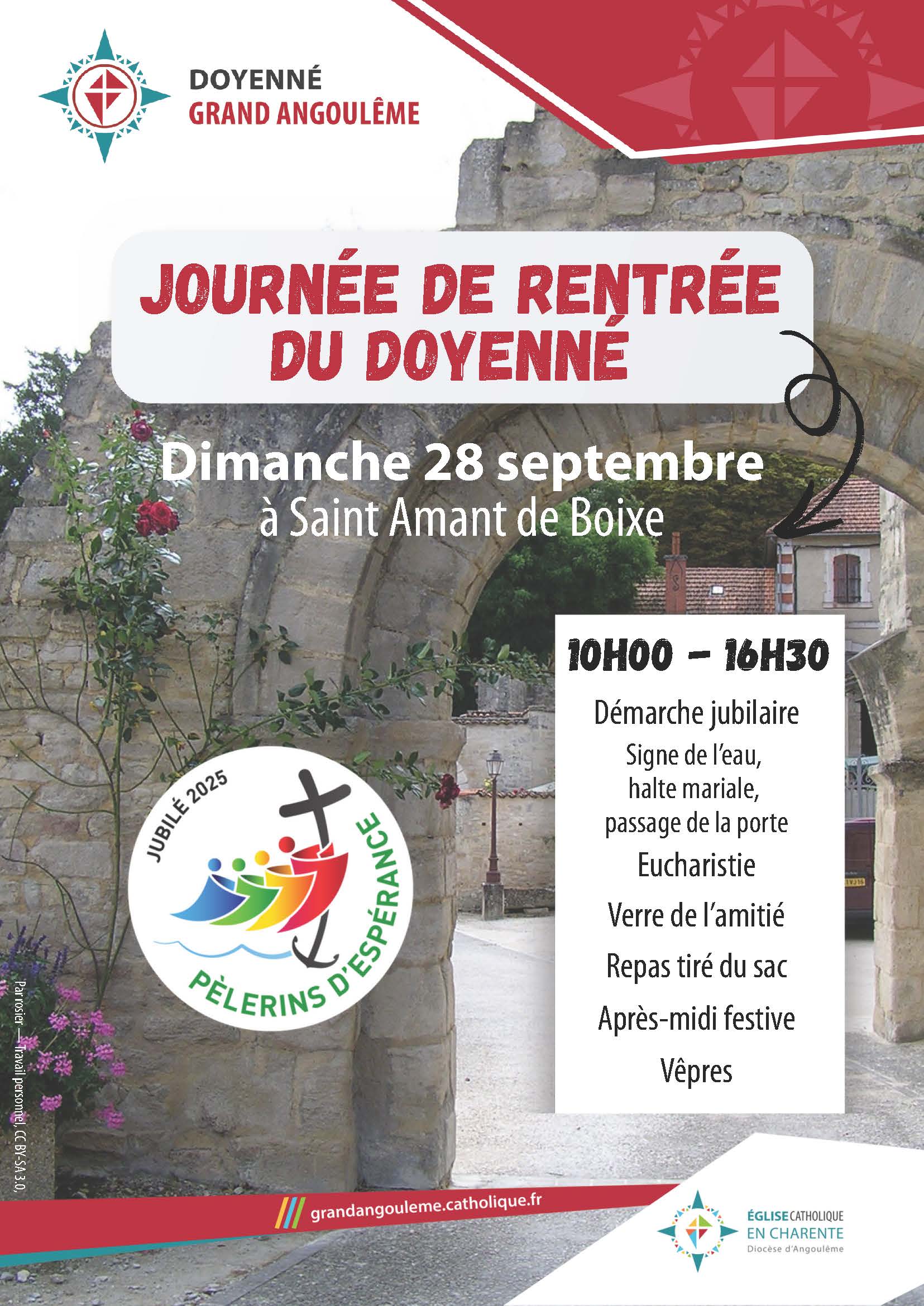 |  | A Saint-Amant de Boixe de 10h à 16h30. Au programme : Démarche Jubilaire avec le signe de l’eau, une procession mariale, le passage de la porte puis l’Eucharistie suivie du verre de l’amitié et du repas tiré du sac. L’après-midi, il vous sera proposé plusieurs activités dont une visite de l’Abbatiale, jeu de pétanque, jeu du mölkky, ou animations libres. Après ce temps récréatif nous terminerons par les Vêpres. | | |