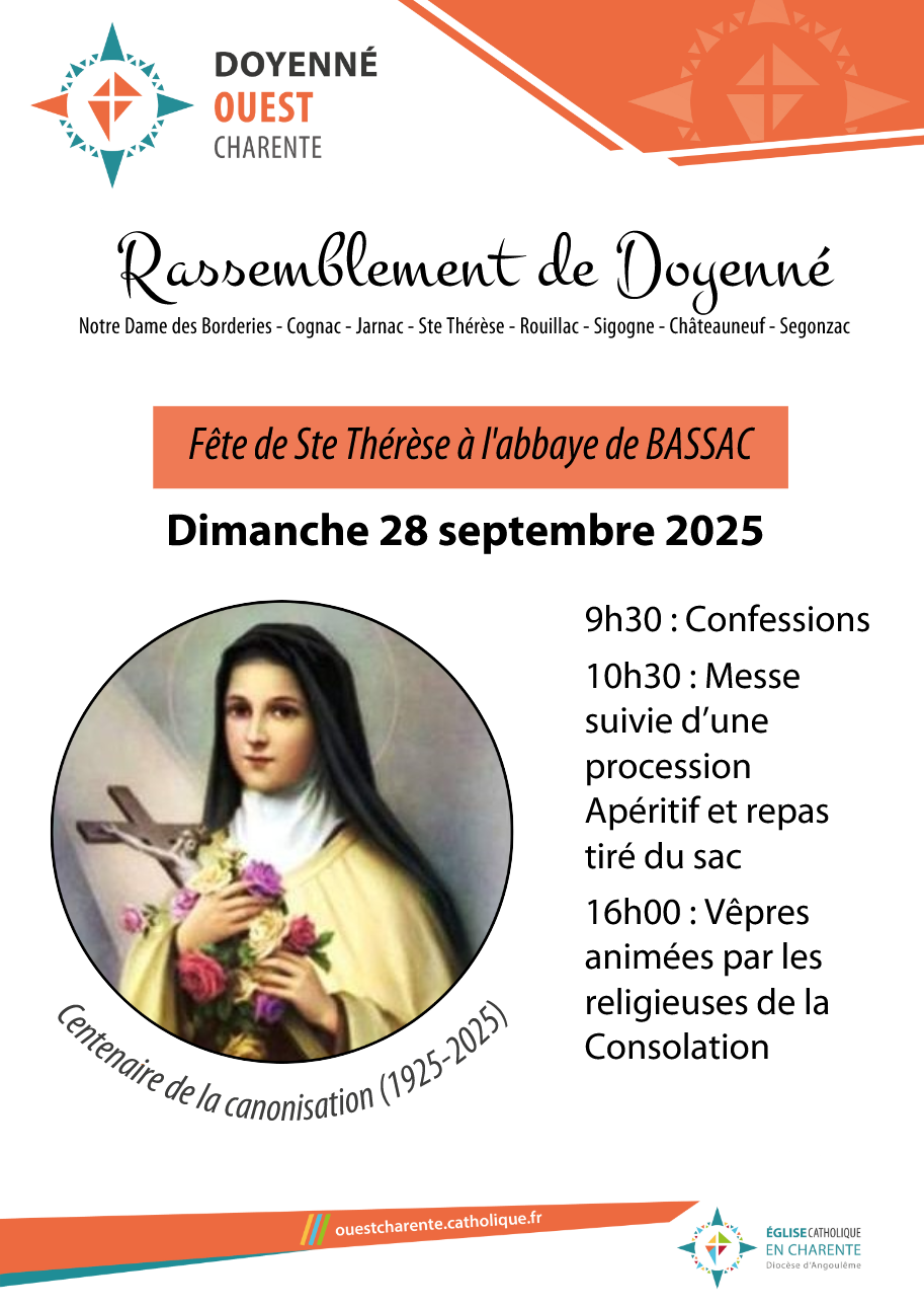 |  | Cette journée est toujours un beau moment de communion, de prière, de retrouvailles après l’été, de partage, de pèlerinage, pour toutes les communautés du doyenné. Venez nombreux pour fêter ensemble Sainte Thérèse et renforcer les liens qui nous unissent ! | | |
