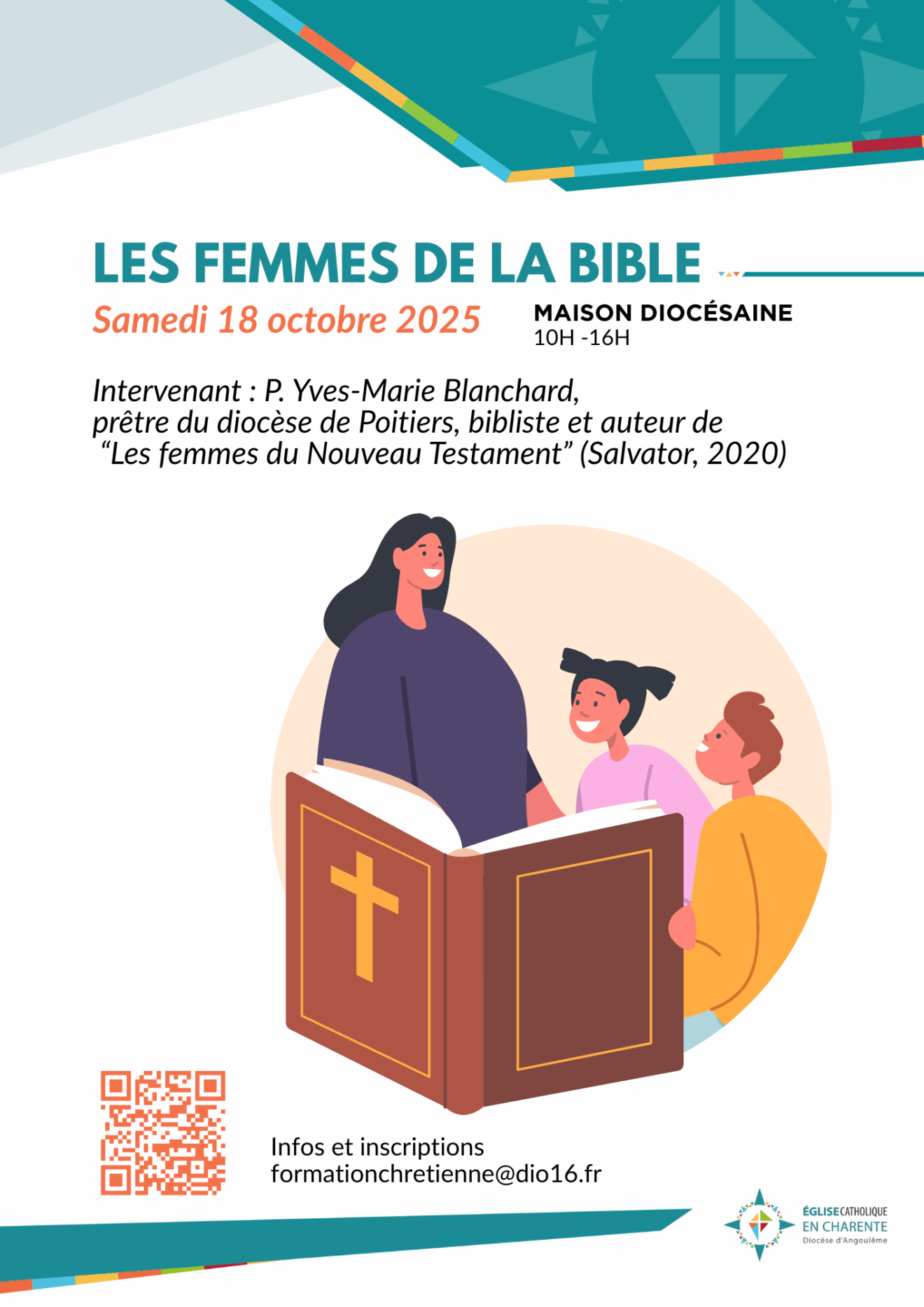 |  | Intervenant : P. Yves-Marie Blanchard, prêtre du diocèse de Poitiers, bibliste et auteur de “Les femmes du Nouveau Testament” (Salvator, 2020) Date : samedi 18 octobre 2025. 10h-16h Lieu : Maison diocésaine | | |