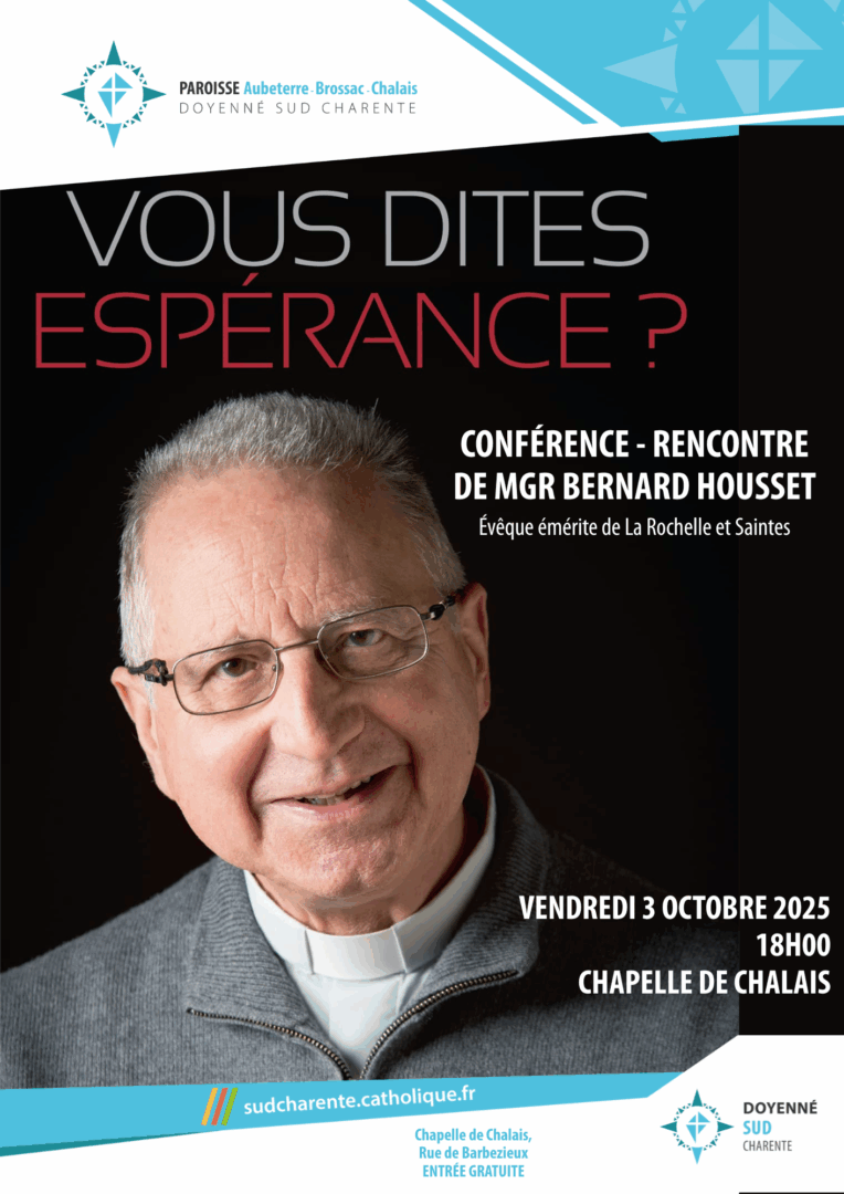 |  | Avec Mgr Housset, évêque émérite de La Rochelle et Sainte, curé de Saint Aigulins. Vendredi 3 octobre, 18h00. A la Chapelle de Chalais | | |