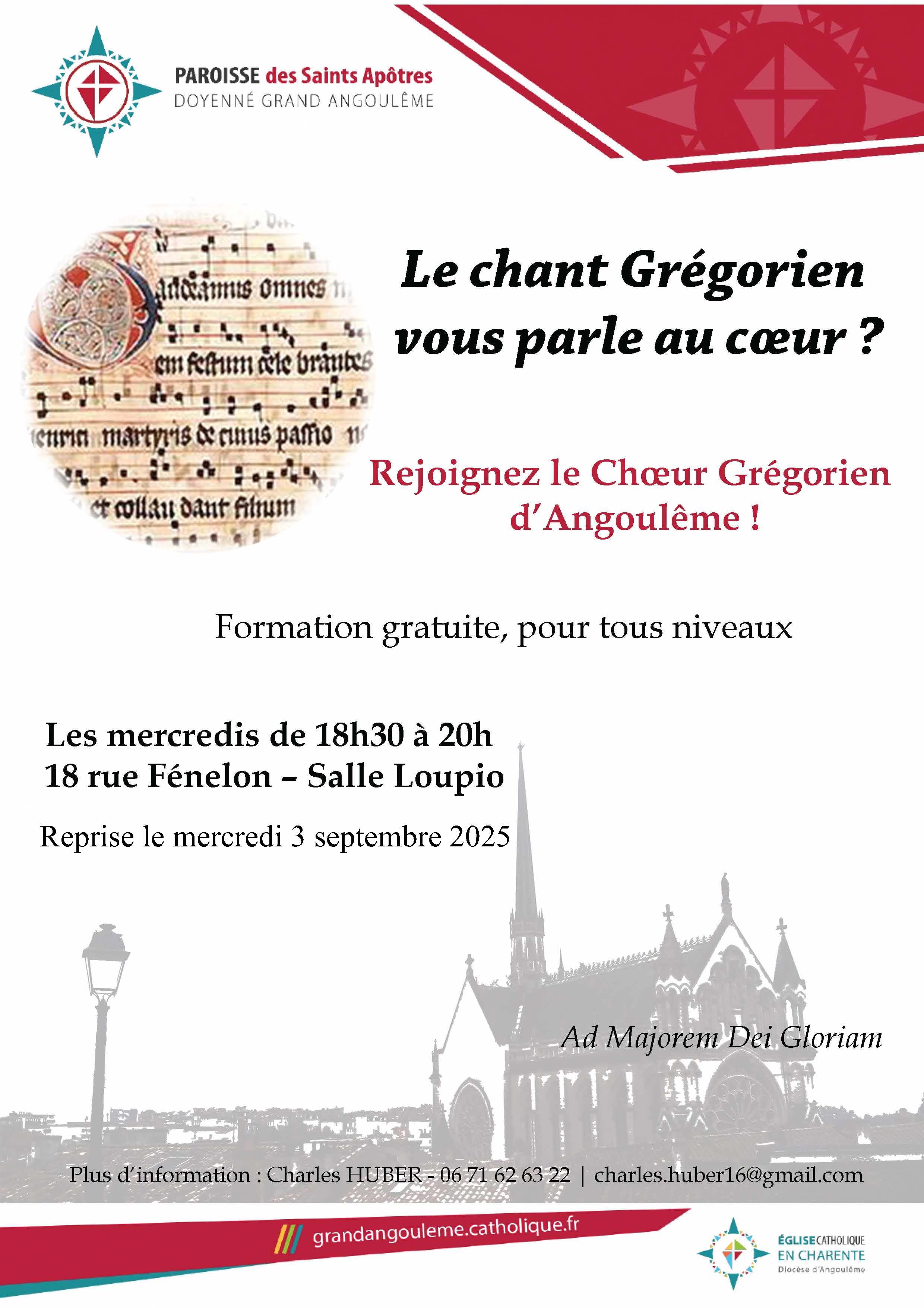 | Tous les 3èmes samedis de chaque mois une messe grégorienne – selon le nouvel ordo (1969) en latin – sera célébrée à la Chapelle des Œuvres (Cathédrale) et chantée par le Chœur Grégorien d’Angoulême. Rejoignez le Choeur Grégorien d’Angoulême ! Prochaine messe Samedi 20 septembre 2025 à la Chapelle des Œuvres (Cathédrale). | |  | Les événements diocésains à venir |