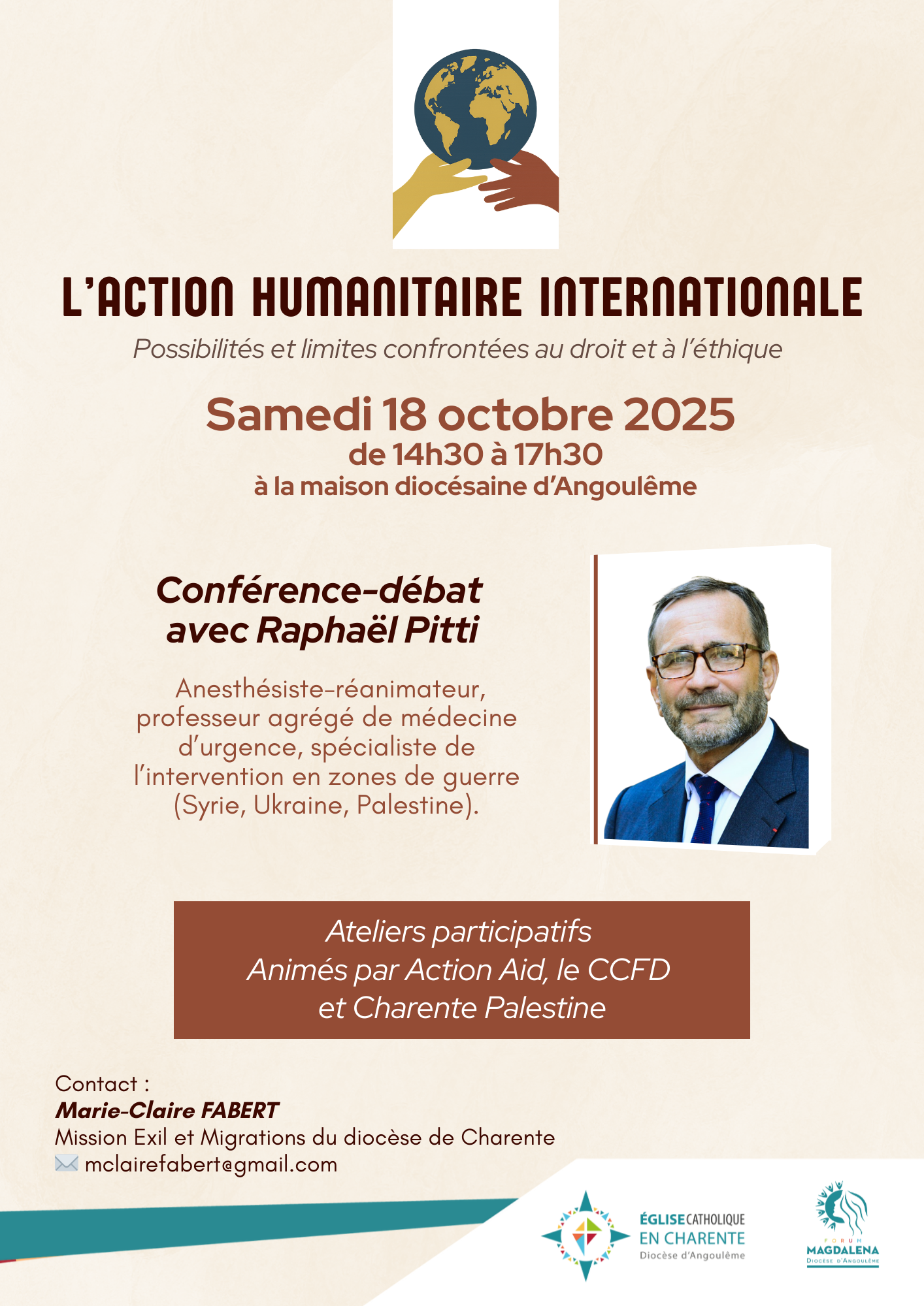 |  | Avec Raphaël Pitti, anesthésiste-réanimateur, professeur agrégé de médecine d’urgence, spécialiste de l’intervention en zones de guerre. Il témoignera de son expérience en Syrie, en Ukraine et en Palestine. Date : samedi 18 octobre 2025. 14h30-17h30 Lieu : Maison diocésaine | | |