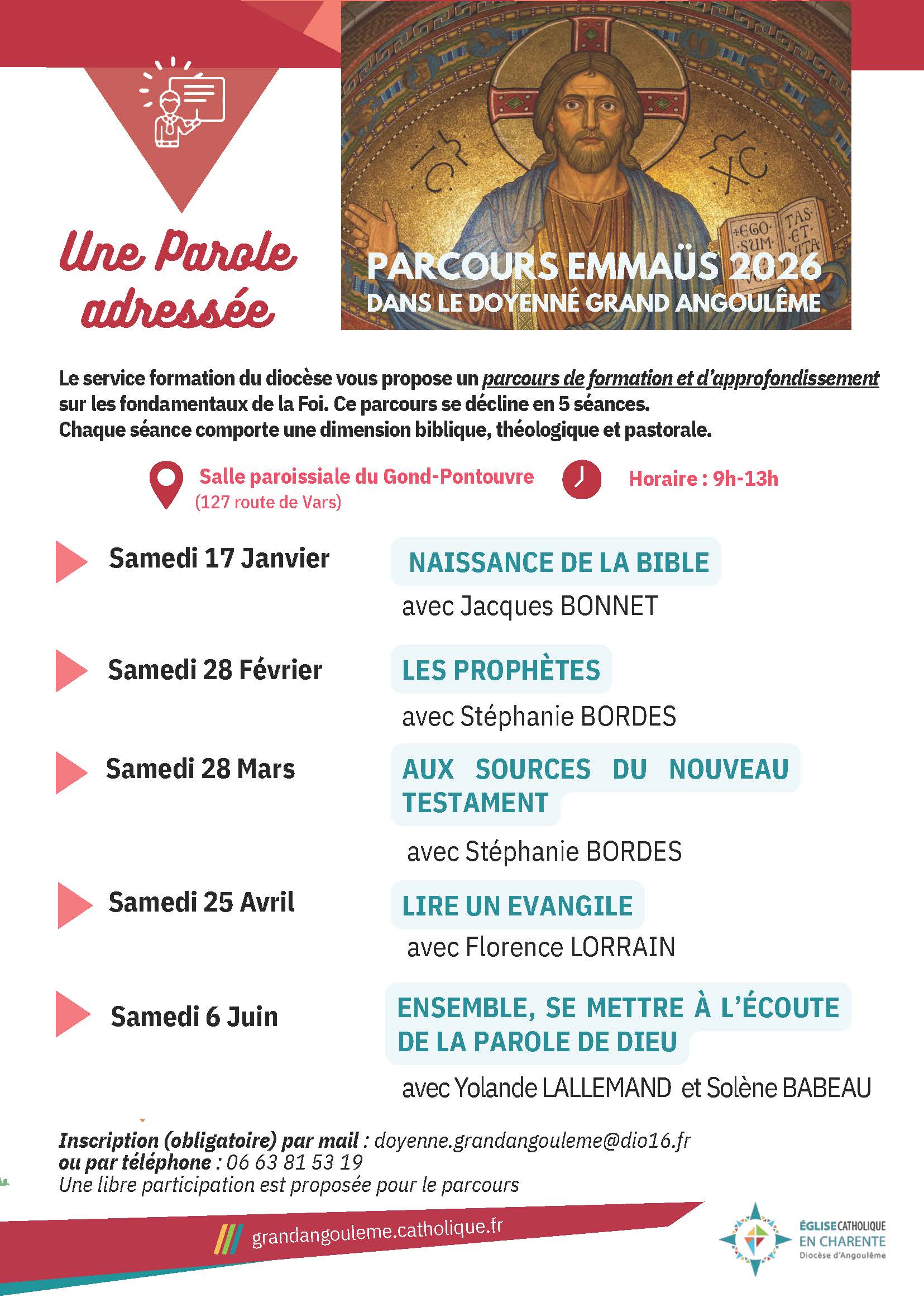 | Samedi 17 janvier 2026 9h – 13h à la Salle paroissiale du Gond Pontouvre | Début du parcours Emmaüs en 5 séance sur le thème biblique : “Une Parole adressée “ | | |