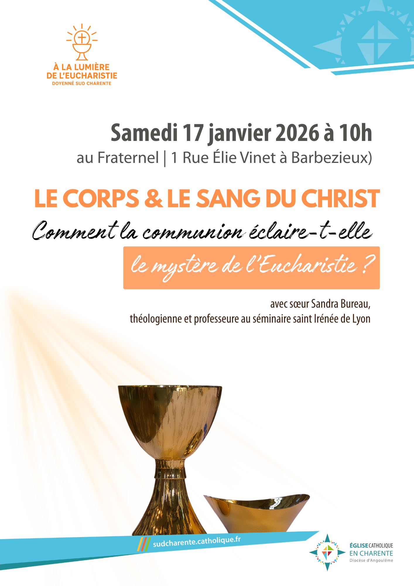 | Samedi 17 janvier 2026 10h – 12h à Barbezieux | Sr Sandra Bureau, théologienne et professeure au séminaire saint Irénée de Lyon, viendra pour une conférence – échanges sur le Corps et le Sang du Christ : comment la communion éclaire-t-elle le Mystère de l’Eucharistie ? | | |