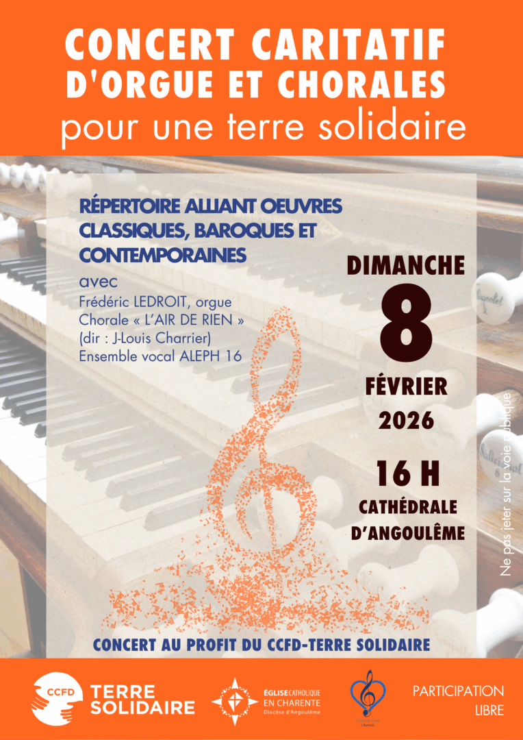 | Le dimanche 8 février 2026 à 16h à la cathédrale, le CCFD Terre solidaire vous convie à un concert caritatif d’orgue et chorales. Frédéric Ledroit (organiste) et la chorale L’air de rien (dir. Jean-Louis Charrier) et l’ensemble vocal Aleph 16 nous feront la joie de nous proposer un répertoire alliant œuvres classiques, baroques et contemporaines. Entrée libre. Pas de réservation. | | |