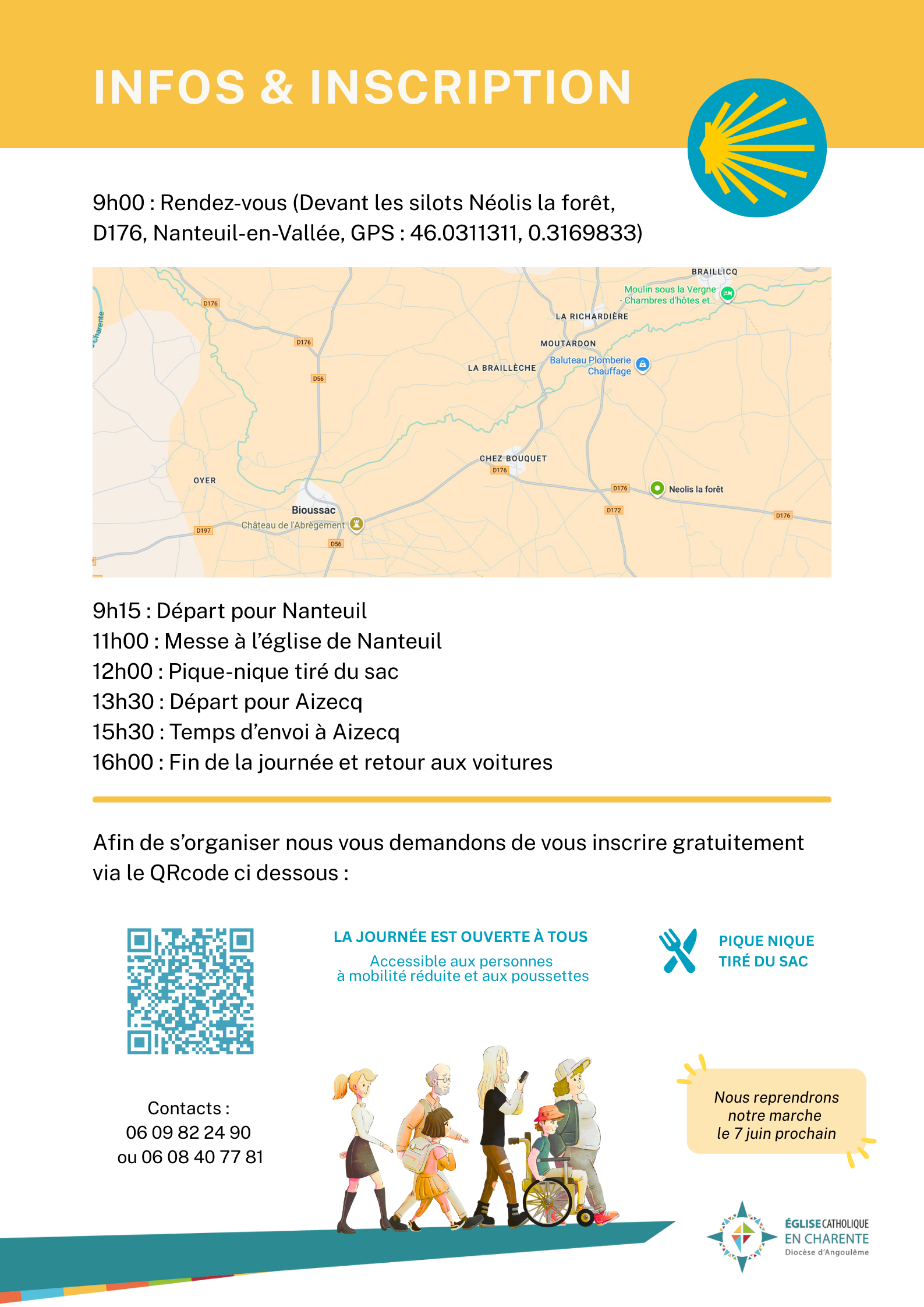 | Journée de marche sur les chemins de Saint-Jacques Et si vous preniez un temps pour marcher, respirer et partager ? La pastorale des familles, avec le soutien du service des Pèlerinages, propose une journée de marche, ouverte à tous, sur les chemins charentais de Saint-Jacques de Compostelle. Dimanche 15 février 2026, de 9h à 16h 📍 Moutardon – Nanteuil – Aizecq Marche facile (10–12 km), visites du patrimoine, temps d’échange, pique-nique partagé et messe du dimanche. Accessible à tous les âges, y compris aux familles avec enfants et aux personnes à mobilité réduite. Renseignements : 06 09 82 24 90 ou 06 08 40 77 81.
