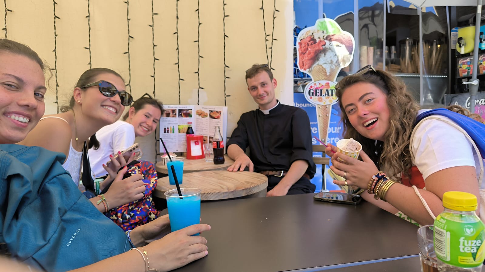 Ce voyage a aussi permis de faire de belles rencontres entre nos deux groupes. Les repas partagés, les moments de fatigue sur les pavés romains, les fou-rires en cherchant notre chemin ou en dégustant une glace artisanale… Nous avions cette grande chance d’être accompagnés par deux prêtres de chaque diocèse, le père Emmanuel Renault de Limoges et le père Maxime Petit (Barbezieux) ainsi que par deux séminaristes (Thibault Lacroix pour Limoges et Benoit-Marie Certin pour Angoulême). Chaque instant a contribué à tisser des liens plus profonds entre nous : certains sont venus en fratrie, d’autres courageux ne connaissaient personne, chacun avec le chemin de foi sur lequel il était, mais tous convaincus qu’ils étaient ici, à leur place, pour vivre des moments de foi intenses et entourés de jeunes !