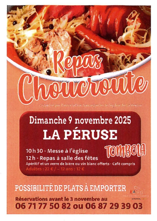 L’association Sauvegarde de l’église de La Péruse vous invite à un repas Choucroute après la messe de 10H30