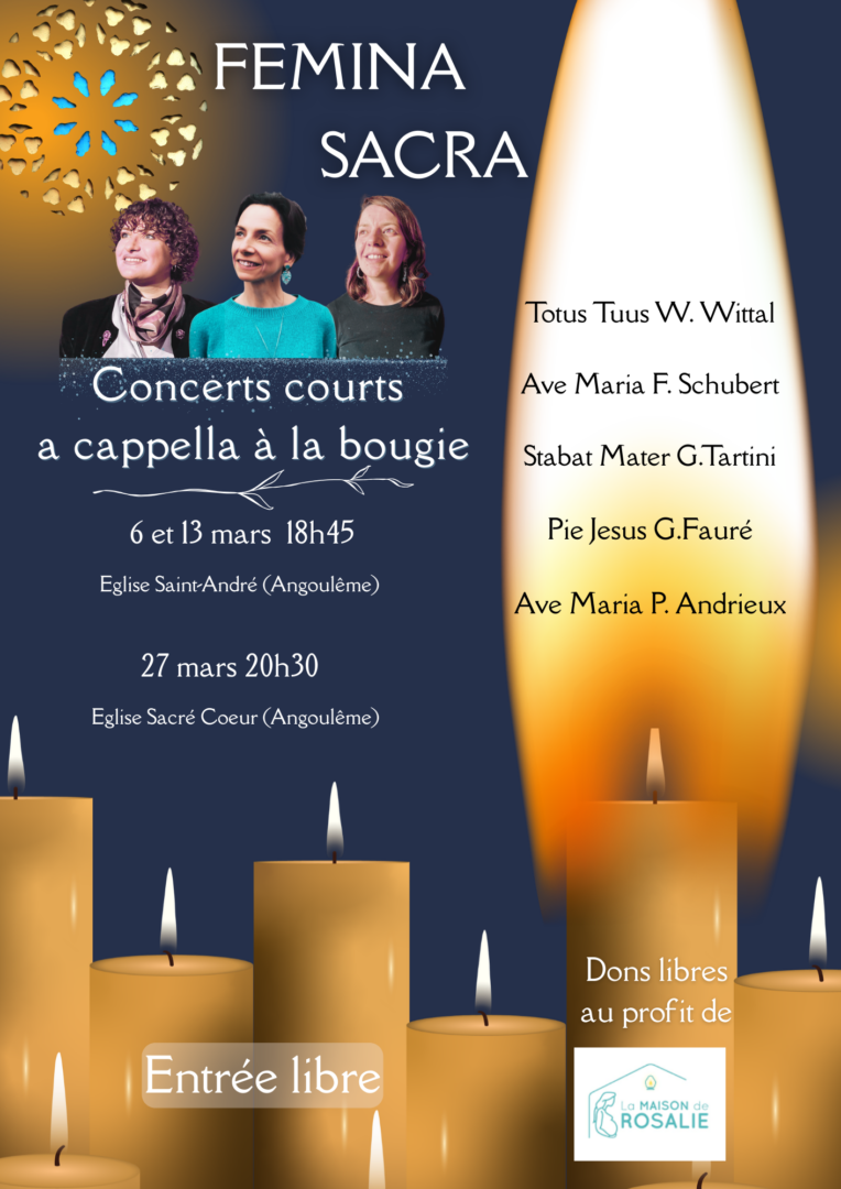 En ce temps de Carême, Aliénor, Cécile et Fanny animées par une foi profonde et passionnées par la musique vous proposent trois petits concerts d’une durée de 30 mn environ, comme une petite parenthèse en fin de journée. L’entrée est libre et les dons seront reversés à la maison de Rosalie.