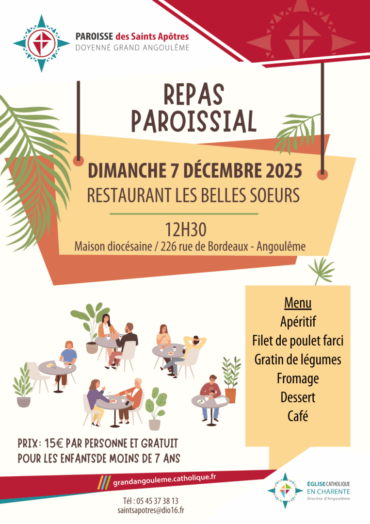 Vous êtes tous invités à notre repas paroissial le dimanche 7 décembre 2025 à 12h30 au restaurant de la maison diocésaine “Les belles sœurs”. Inscriptions obligatoires avec le règlement correspondant.