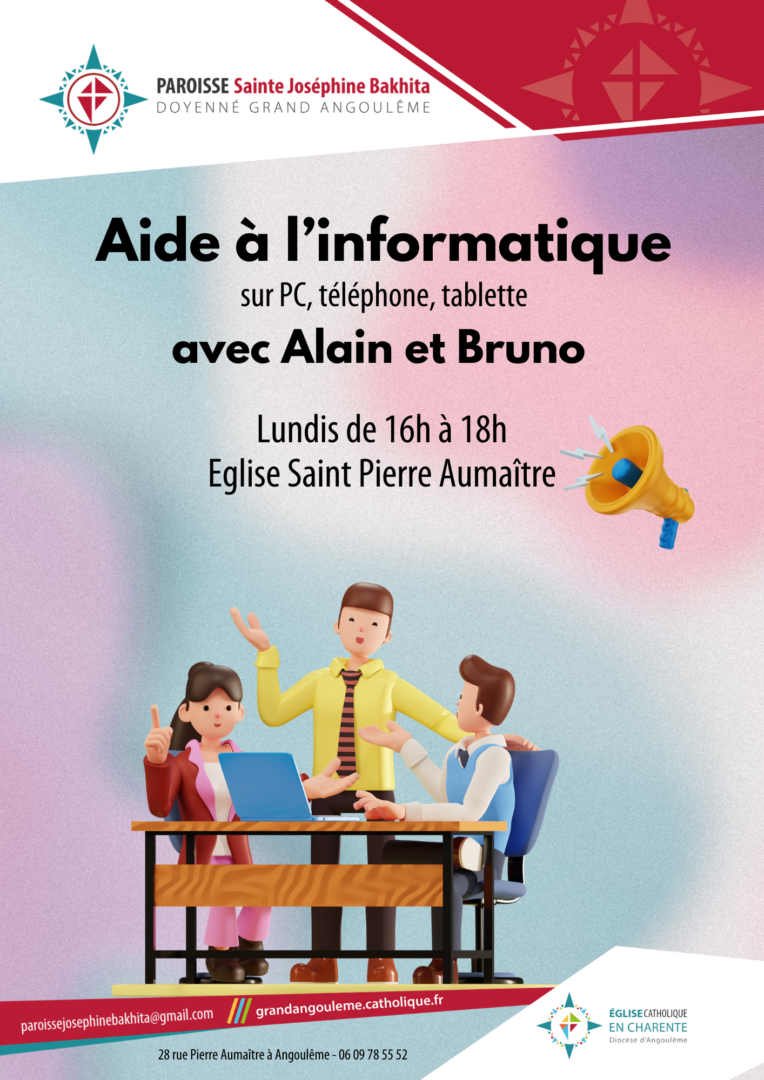 Bruno et Alain vous accueillent tous les lundis de 16h à 18h, dans les salles paroissiales de l’église Saint Pierre Aumaître. Ils pourront répondre à vos questions et vous aideront à résoudre vos problèmes sur PC, téléphone, tablette. C’est un atelier ouvert à tous, n’hésitez pas à le faire connaître autour de vous !