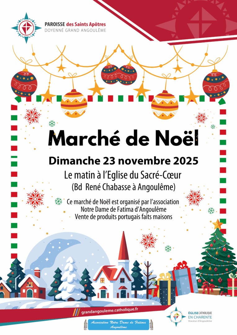 Marché de Noël au Sacré-Coeur Saint Roch - Sacré Cœur Partager Sur FacebookSur TwitterSur LinkedinSur WhatsappPar Email 23novembre Diocèse d'Angoulême Grand Angoulême Saint Roch - Sacré Cœur Agenda Partagez cette page à vos amis ! Télécharger au format PDFInformations Eglise du Sacré-Coeur - Bd Chabasse - 16000 Angoulême dimanche 23 novembre à 10h00 Voir le site de la paroisseContact Père Justin Bationo 45 Rue Alfred de Vigny, 16000 Angoulême 06 44 74 35 99 05 45 95 22 37 07 80 88 28 42 paroisse.saintroch.sacrecoeur@dio16.fr