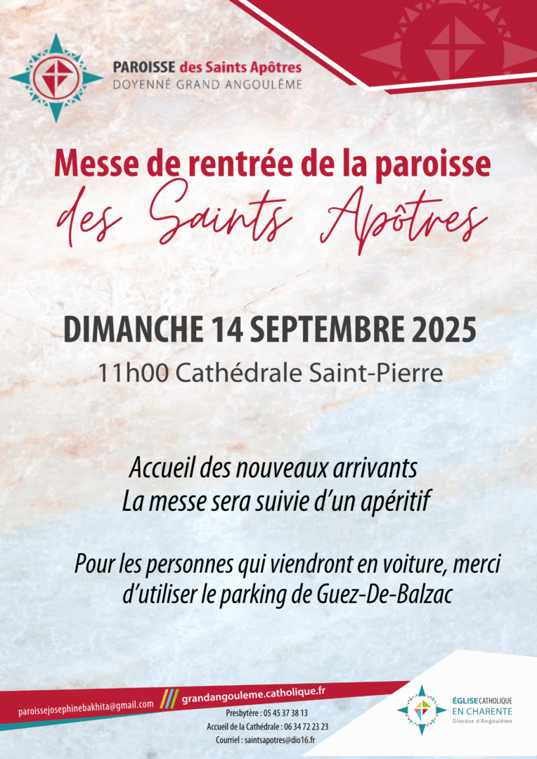 Je recherche Par nom de paroisse Saints ApôtresSaint Amant – Gond – ChampniersSoyaux – Vallée de l’ÉchelleVisitation sur BoëmeSaint Cybard sur Charente et NouèreSaint Roch – Sacré CœurNotre Dame des SourcesSainte Joséphine BakhitaNotre Dame des Terres en Haute-CharenteConfolens – Chabanais – Champagne-MoutonSaint Augustin en Tardoire et BandiatRuffecSt Léger de MansleVillefagnanBarbezieux – Baignes – BarretAubeterre – Chalais – BrossacMontmoreau – Blanzac – Villebois-LavaletteJarnacChâteauneuf - Saint Pierre de SegonzacCognacAigreNotre-Dame des BorderiesCommunauté des Serviteurs de la MiséricordeSaint-Pierre de Segonzac Par nom de commune AbzacAgrisAignes-et-PuypérouxAigreAizecqAlloueAmbéracAmbernacAmblevilleAnaisAngeac-ChampagneAngeac-CharenteAngeducAngoulême - Centre VilleAngoulême - La Grand FontAngoulême - La Grande Garenne - BasseauAngoulême - Ma-CampagneAngoulême - Saint CybardAngoulême - Saint-MartialAngoulême - Victor HugoAnsac-sur-VienneAnvilleArsAsnières-sur-NouèreAubeterreAubevilleAuge-Saint-MédardAunacAunac-sur-CharenteAussac-VadalleBaignesBalzacBarbezièresBarbezieuxBardenacBarretBarroBassacBayersBazacBeaulieu-sur-SonnetteBécheresseBellevigneBellonBenestBernacBerneuilBesséBignacBioussacBiracBlanzacBlanzaguet-Saint-CybardBoisbreteauBoisné-la-TudeBonnesBonneuilBonnevilleBors-de-BaignesBors-de-MontmoreauBouëxBourg-CharenteBoutevilleBoutiers-Saint-TrojanBranBrettesBrévilleBrieBrie-sous-BarbezieuxBrie-sous-ChalaisBrigueuilBrillacBrossacBunzacCathédraleCellefrouinCellettesChabanaisChabracChadurieChalaisChallignacChampagne-MoutonChampagne-VignyChampmillonChampniersChantillacChantrezacCharmantCharméCharrasChasseneuilChassenonChassiecqChassorsChâteaubernardChâteauneuf-sur-CharenteChâtignacChavenatChazellesChenommetChenonCherves-ChâtelarsCherves-RichemontChillacChiracClaixCognacCombiersCondacCondéonConfolensCoteaux-du-BlanzacaisCoulgensCoulongesCourbillacCourcômeCourgeacCourlacCoutureCressac-Saint-GenisCriteuil-la-MagdeleineCuracDeviatDignacDiracDouzatÉbréonÉchallatÉcurasÉdonEmbourieEmpuréÉpenèdeÉravilleEsseÉtagnacÉtriacExideuilEymouthiersFeuilladeFléacFleuracFontclaireauFontenilleFouquebruneFouqueureFoussignacGaratGardes-le-PontarouxGenacGenouillacGensac-la-PallueGentéGimeuxGond-PontouvreGondevilleGourvilleGrassacGraves-Saint-AmantGuimpsGuizengeardGuratHiersacHiesseHouletteJarnacJauldesJavrezacJuignacJuillac-le-CoqJuillaguetJuilléJulienneJurignacL'HoumeauL'Isle d'EspagnacLa ChapelleLa ChèvrerieLa CouronneLa FayeLa MagdeleineLa PéruseLa RochefoucauldLa Rochefoucauld-en-AngoumoisLa RochetteLa TâcheLa-Forêt-de-TesséLachaiseLadivilleLagarde-sur-le-NéLaméracLapradeLe BouchageLe Grand-MadieuLe LindoisLe TâtreLe Vieux-CérierLes AdjotsLes EssardsLes GoursLes MétairiesLes PinsLésignac-DurandLessacLesterpsLichèresLignéLignières-SonnevilleLinarsLondignyLongréLonnesLouzac-Saint-AndréLupsaultLussacLuxéMagnac-LavaletteMagnac-sur-TouvreMaine-de-BoixeMainfondsMainxeMainxe-GondevilleMainzacMalavilleManotMansleMarcillac-LanvilleMareuilMarillac-le-FrancMarsacMarthonMassignacMaumontMazerollesMazièresMédillacMérignacMerpinsMesnacMesseuxMonsMontboyerMontbronMontchaudeMontemboeufMontignac-CharenteMontignac-le-CoqMontignéMontjeanMontméracMontmoreauMontrolletMornacMosnacMoulidarsMoulins-sur-TardoireMoutardonMouthiersMoutonMoutonneauMouzonNabinaudNanclarsNanteuil-en-ValléeNercillacNersacNieuilNonacNonavilleObezineOradourOradour-FanaisOrgedeuilOriollesOrivalPaizay-NaudouinPalluaudParzacPassiracPéreuilPérignacPillacPlaizacPlassac-RouffiacPleuvillePougnéPoullignacPoursacPranzacPressignacPuymoyenPuyréauxRaixRancogneRanville-BreuillaudReignacRéparsacRioux-MartinRivièresRonsenacRouffiacRougnacRouillacRoulletRoumazières-LoubertRoussinesRouzèdeRuelleRuffecSacré-CœurSaint-AdjutorySaint-Amant-de-BoixeSaint-Amant-de-BonnieureSaint-Amant-de-MontmoreauSaint-Amant-de-NouèreSaint-AndréSaint-AngeauSaint-AntoineSaint-Aulais-la-ChapelleSaint-AusoneSaint-AvitSaint-BonnetSaint-BriceSaint-ChristopheSaint-Ciers-sur-BonnieureSaint-ClaudSaint-CoutantSaint-CybardSaint-CybardeauxSaint-EutropeSaint-FélixSaint-Fort-sur-le-NéSaint-FraigneSaint-FrontSaint-Genis d'HiersacSaint-GeorgesSaint-Germain-de-ConfolensSaint-Germain-de-MontbronSaint-GervaisSaint-GoursonSaint-GrouxSaint-JacquesSaint-Laurent-de-BelzagotSaint-Laurent-de-CerisSaint-Laurent-de-CognacSaint-Laurent-des-CombesSaint-LégerSaint-LégerSaint-MartialSaint-Martin-du-ClocherSaint-MarySaint-Maurice-des-LionsSaint-Médard-de-BarbezieuxSaint-Même-les-CarrièresSaint-MichelSaint-Palais-du-NéSaint-PreuilSaint-Projet-Saint-ConstantSaint-Quentin-de-ChalaisSaint-Quentin-sur-CharenteSaint-RochSaint-RomainSaint-SaturninSaint-SéverinSaint-SimeuxSaint-SimonSaint-SorninSaint-Sulpice-de-CognacSaint-Sulpice-de-RuffecSaint-VallierSaint-YrieixSainte-ColombeSainte-SévèreSainte-SoulineSalles-d'AnglesSalles-de-BarbezieuxSalles-de-VillefagnanSalles-LavaletteSaulgondSauvagnacSauvignacSegonzacSersSigogneSireuilSonnevilleSouffrignacSouvignéSoyauxSuauxSurisTaizéTaponnat-FleurignacTerres-de-Haute-CharenteTheil-RabierTorsacTourriersTouvéracTouvreTouzacTriac-LautraitTrois-PalisTurgonTussonTuzieVal-d'AugeVal-de-BonnieureVal-des-VignesValenceVarsVaux-LavaletteVaux-RouillacVentouseVerdilleVerneuilVerrièresVerrièresVervantVibracVieux-RuffecVignollesVilhonneurVillebois-LavaletteVillefagnanVillegatsVillejésusVillejoubertVilliers-le-RouxVillognonVindelleVitrac-Saint-VincentVivilleVoeuil-et-GigetVouharteVoulgézacVouthonVouzanXambesYviersYvrac-et-Malleyrand Dans le site Un horaire de messe Insérer/modifier un lien Fermer Saisissez l’URL de destination URL Texte du lien Ouvrir le lien dans un nouvel ongletOu alors, faites un lien vers l’un des contenus de votre site Rechercher Aucun mot n’a été donné pour cette recherche. Voici les recherches précédentes. Recherchez ou utilisez les flèches haut et bas pour choisir un élément. Annuler