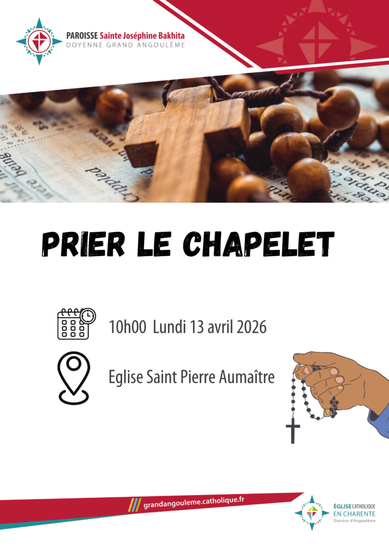 Prière du chapelet à Saint Pierre Aumaître Sainte Joséphine Bakhita Partager Sur FacebookSur TwitterSur LinkedinSur WhatsappPar Email 13avril Diocèse d'Angoulême Grand Angoulême Sainte Joséphine Bakhita Agenda On se retrouve lundi 13 avril pour prier ensemble le chapelet à l’église Saint Pierre Aumaître.Partagez cette page à vos amis ! Télécharger au format PDFInformations Eglise Saint Pierre Aumaître lundi 13 avril à 10h00 Voir le site de la paroisseContact Paroisse Sainte Joséphine Bakhita 2 Boulevard Jean Moulin, Angoulême 05 45 61 15 04 Eglise St Paul et St Vincent 06 09 78 55 52 Eglise St Pierre Aumaître 28 rue P. Aumaître Angoulême paroissejosephinebakhita@gmail.com