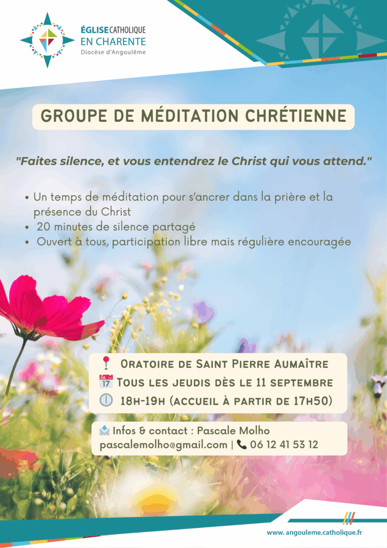 Temps de méditation avec Pascale Molho à St Pierre Aumaître Sainte Joséphine Bakhita Partager Sur FacebookSur TwitterSur LinkedinSur WhatsappPar Email 09octobre Diocèse d'Angoulême Grand Angoulême Sainte Joséphine Bakhita Agenda Venez partager un temps de méditation dans la chapelle de St Pierre Aumaître tous les jeudi à partir de 18h.Partagez cette page à vos amis ! Télécharger au format PDFInformations Oratoire de Saint Pierre Aumaître jeudi 09 octobre à 18h00 Voir le site de la paroisseContact Paroisse Sainte Joséphine Bakhita 2 Boulevard Jean Moulin, Angoulême 05 45 61 15 04 Eglise St Paul et St Vincent 06 09 78 55 52 Eglise St Pierre Aumaître 28 rue P. Aumaître Angoulême paroissejosephinebakhita@gmail.com