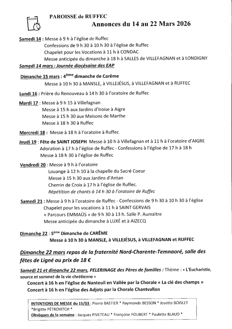 ANNONCES DU 14 AU 22 Mars 2026