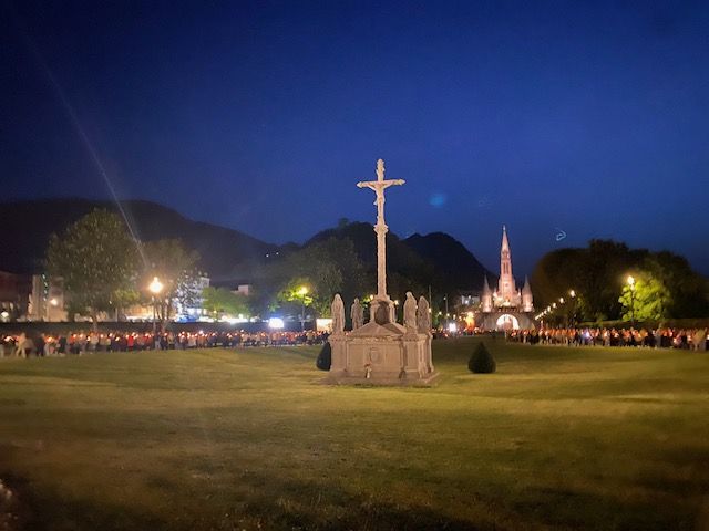 Que dire ensuite de la procession aux flambeaux partagée avec des pèlerins venus de divers pays chacun priant le chapelet dans sa propre langue ! Quel bonheur de pouvoir méditer en cheminant côte à côte, flambeaux allumés, de la grotte vers la basilique !