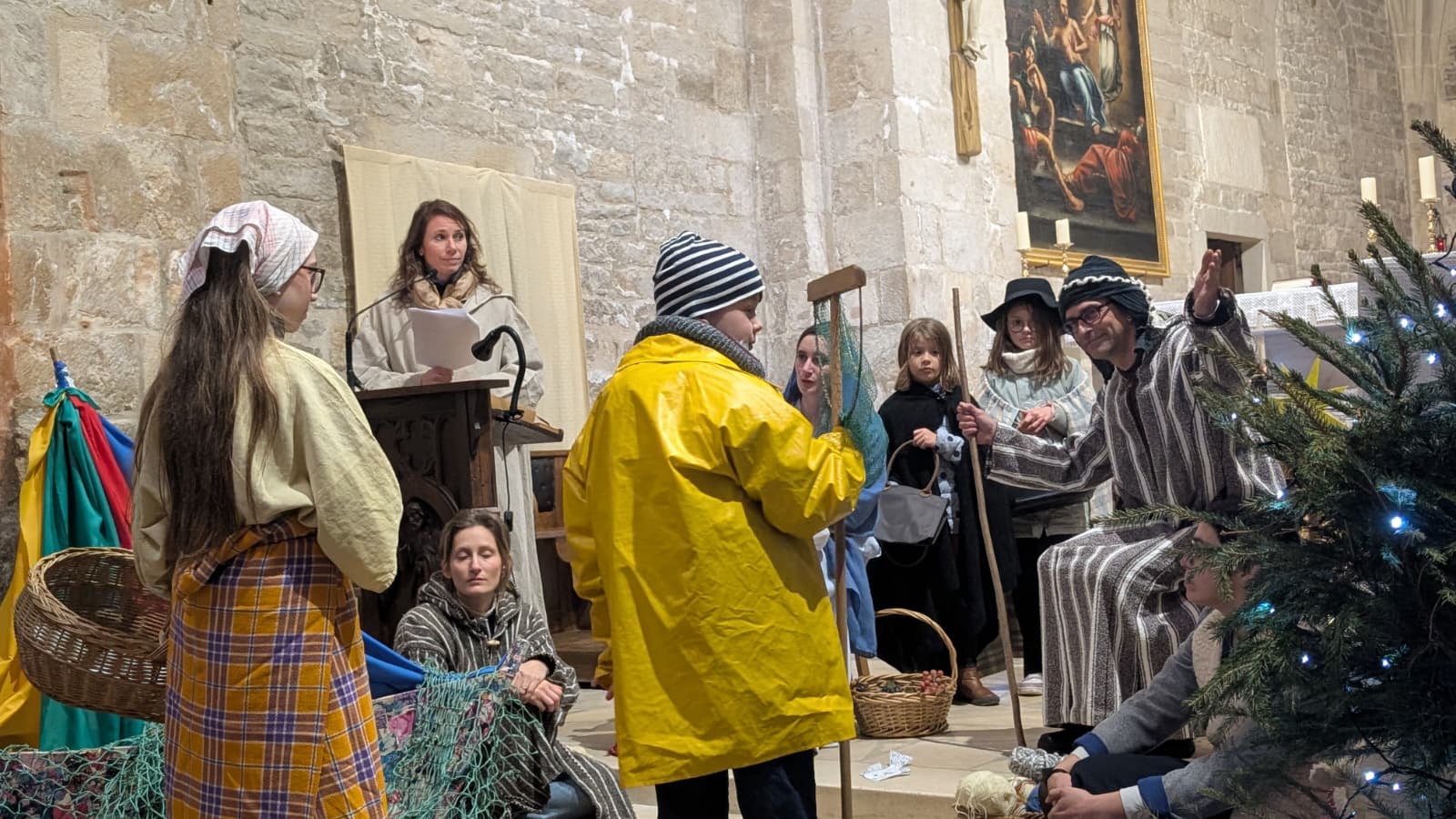 À travers ce récit, les habitants ont vu défiler symboliquement les différents corps de métier du village, boulanger, pâtissier, pêcheur, menuisier… venus se présenter à la Sainte Famille et offrir leurs cadeaux, rejoints ensuite par Madame le Maire!