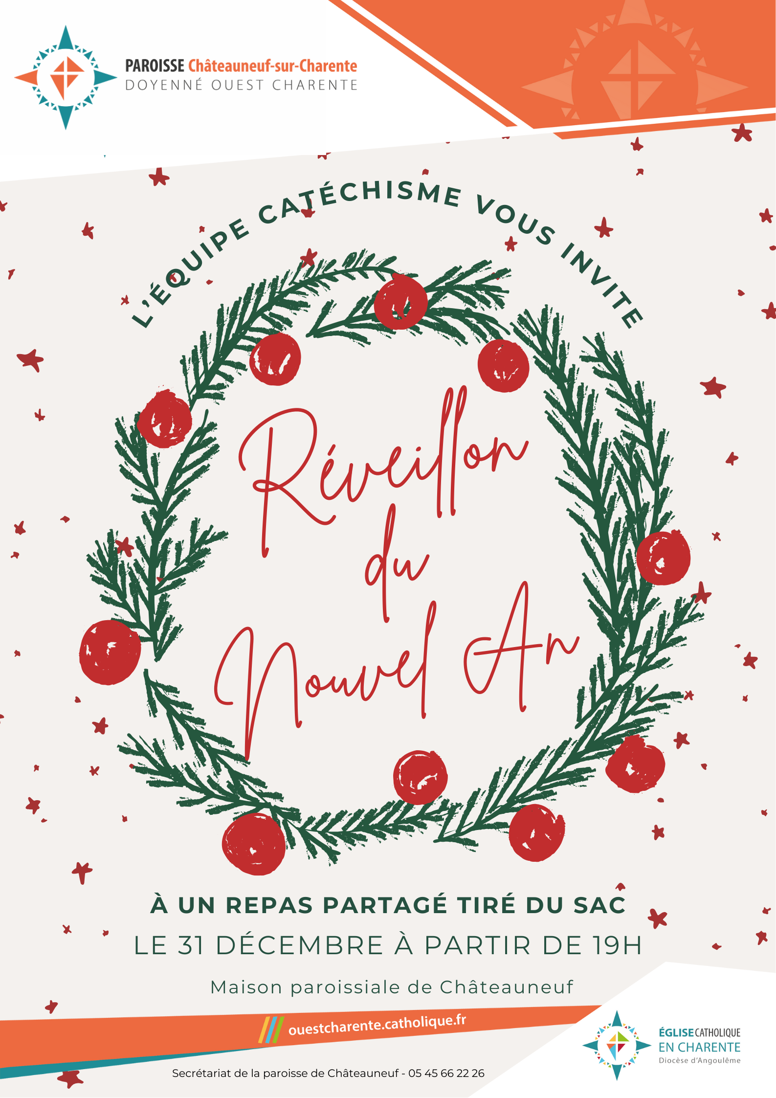 Réveillon du Nouvel An à Châteauneuf Châteauneuf – Segonzac Partager Sur FacebookSur TwitterSur LinkedinSur WhatsappPar Email 31décembre Diocèse d'Angoulême Ouest Charente Châteauneuf – Segonzac Agenda Le 31 décembre à partir de 19h00Réponse avant le 20 décembre !Partagez cette page à vos amis ! Télécharger au format PDFInformations Maison Paroissiale Châteauneuf-sur-Charente, France mercredi 31 décembre 2025 à 19h00 Voir le site de la paroisseContact Secrétariat 05 45 66 22 26 Châteauneuf .......05 45 83 40 07 Segonzac paroisse.chateauneuf@dio16.fr paroisse.segonzac@dio16.fr